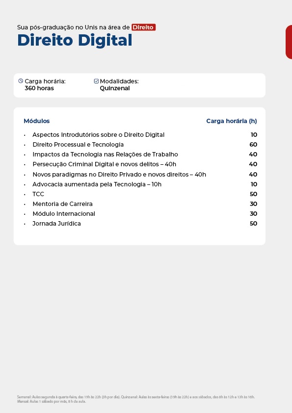 A Pós-graduação em Direito Digital do Centro Universitário do Sul de Minas – UNIS/MG foi desenvolvida ao verificar que os desafios dos profissionais do direito têm crescido substancialmente nas últimas décadas, em virtude de profundas mudanças sociais e estruturais da sociedade e da tecnologia.