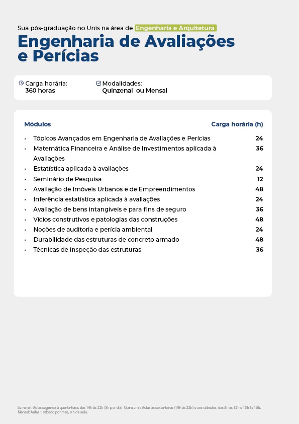 A Pós-graduação em Engenharia de Avaliações e Pericias, tem como principal objetivo do curso é desenvolver as habilidades e competências para que os alunos possam, como profissionais especializados, aprimorar técnicas e gerenciar tarefas no campo da Engenharia de Avaliações e Perícias, tornando-se aptos a execução de laudos técnicos que contemplem um estudo das patologias e danos nos bens e avaliações criteriosas de bens móveis e imóveis, embasados nas normas específicas da ABNT e da legislação nacional pertinente à matéria.