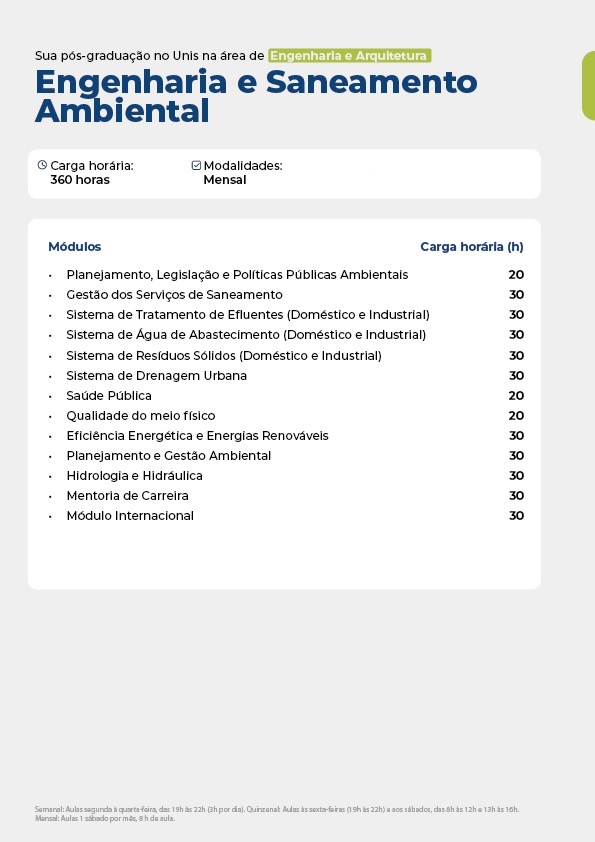 A Pós-graduação em Engenharia e Saneamento ambiental proporciona aos profissionais uma visão holística sobre a relação entre a saúde pública, o saneamento e o ambiente, capacitando-os para atuarem na elaboração e execução de projetos de engenharia sanitária.