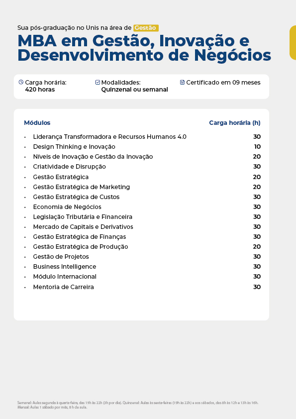 O curso de MBA em Gestão, Inovação e Desenvolvimento de Negócios pretende formar egressos que sejam profissionais qualificados para trabalhar na área de Gestão e Inovação, capaz de criar novos processos que possam facilitar a vida das pessoas no dia a dia, com eficiência, minimizando riscos, incrementando a qualidade e, essencialmente, disponibilizando acesso a produtos e serviços mais eficazes e com preços competitivos. Melhorar resultados, com conforto e segurança para clientes e consumidores por intermédio de soluções ágeis e disruptivas.