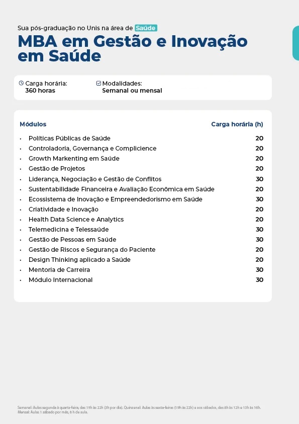 A Pós-graduação Gestão e Inovação em Saúde, visa formar profissionais especialistas na área de gestão em saúde, dotado de conhecimentos, habilidades e atitudes necessárias ao exercício profissional nesta área, visando interesses convergentes do setor privado e do setor público, capaz de planejar, organizar e supervisionar o funcionamento dos setores da saúde com economia e racionalidade, e principalmente inovação.