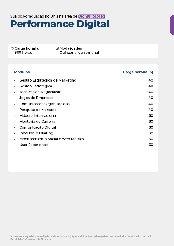 O curso foi concebido para desenvolver gestores para atuar na era digital, com visão estratégica e conhecimento técnico em planejamento de ações criativas e inovadoras de marketing e comunicação. Além de apresentar e refletir sobre as recentes transformações nos diversos mercados e nas relações de negócios como consequência da expansão do ambiente online e das mídias digitais, o profissional deve ser capaz de analisar dados e tomar decisões mais assertivas na comunicação.