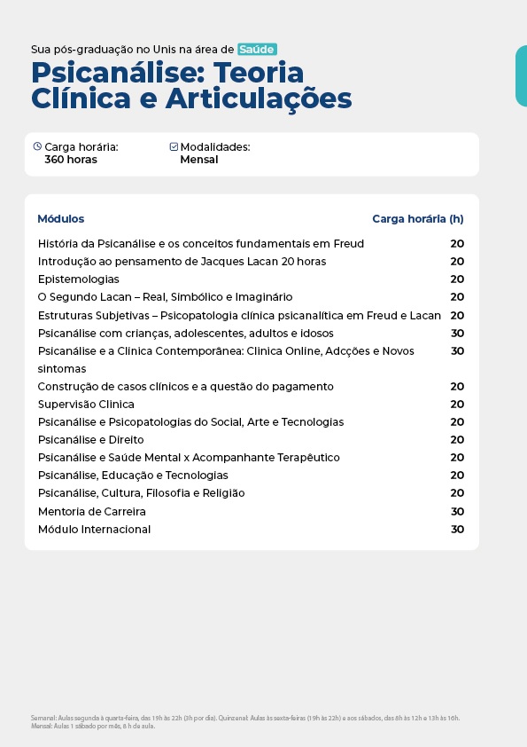 Assim, o curso oferece a oportunidade para que o discente conheça e se aprofunde nos diferentes conceitos da psicanálise, entendendo os impactos e as implicações desta ciência no comportamento humano.